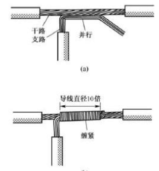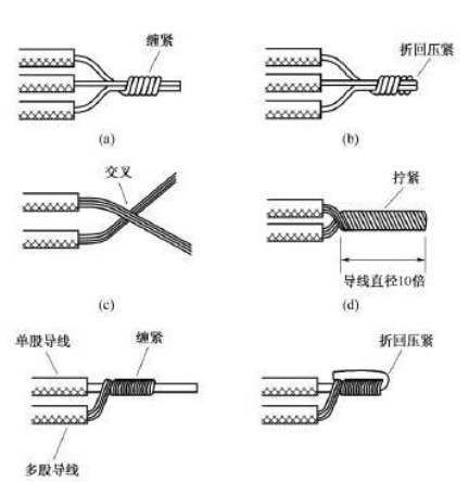 当需要连接的导线来自同一方向时,可以釆用图10所示的方法。对于单股导线,可将一根导线的芯线紧密缠绕在其他导线的芯线上,再将其他芯线的线头折回压紧即可。对于多股导线,可将两根导线的芯线互相交叉,然后绞合拧紧即可。对于单股导线与多股导线的连接,可将多股导线的芯线紧密缠绕在单股导线的芯线上,再将单股芯线的线头折回压紧即可。