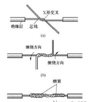 小截面单股铜导线连接方法如图1所示,先将两导线的芯线线头作X形交叉,再将它们相互缠绕2〜3圈后扳直两线头,然后将每个线头在另一芯线上紧贴密绕5〜6圈后剪去多余线头即可。