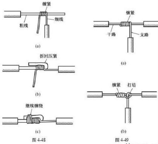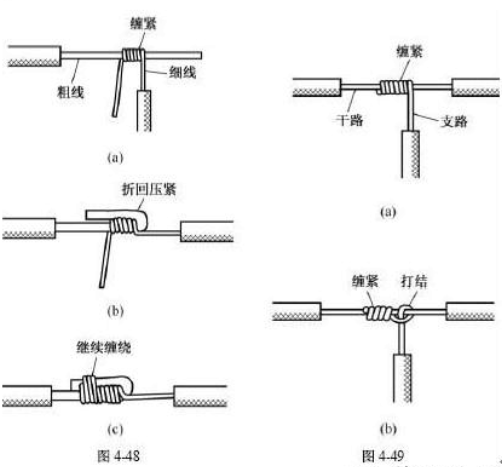 不同截面单股铜导线连接方法如下图所示,先将细导线的芯线在粗导线的芯线上紧密缠绕5〜6圈,然后将粗导线芯线的线头折回紧压在缠绕层上,再用细导线芯线在其上继续缠绕3〜4圈后剪去多余线头即可。