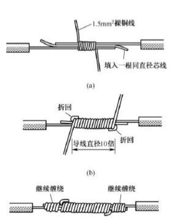 大截面单股铜导线连接方法如下图所示,先在两导线的芯线重叠处填入一根相同直径的芯线,再用一根截面约1.5imm2的裸铜线在其上紧密缠绕,缠绕长度为导线直径的10倍左右,然后将被连接导线的芯线线头分别折回,再将两端的缠绕裸铜线继续缠绕5〜6圈后剪去多余线头即可。