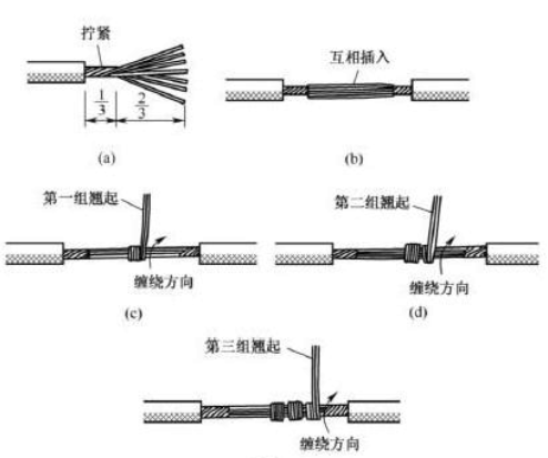 另一种方法如图8所示,将支路芯线靠近绝缘层的约1/8芯线绞合拧紧,其余7/8芯线分为两组[见图8(a)],一组插入干路芯线当中,另一组放在干路芯线前面,并朝右边按图 8(b)所示方向缠绕4〜5圈。再将插入干路芯线当中的那一组朝左边按图8(c)所示方向缠绕4〜5圈,连接好的导线如图8(d)所示。