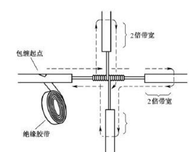 对导线的十字分支接头进行绝缘处理时,包缠方向如图14所示,走一个十字形的来回,使每根导线上都包缠两层绝缘胶带,每根导线也都应包缠到完好绝缘层的两倍胶带宽度处。