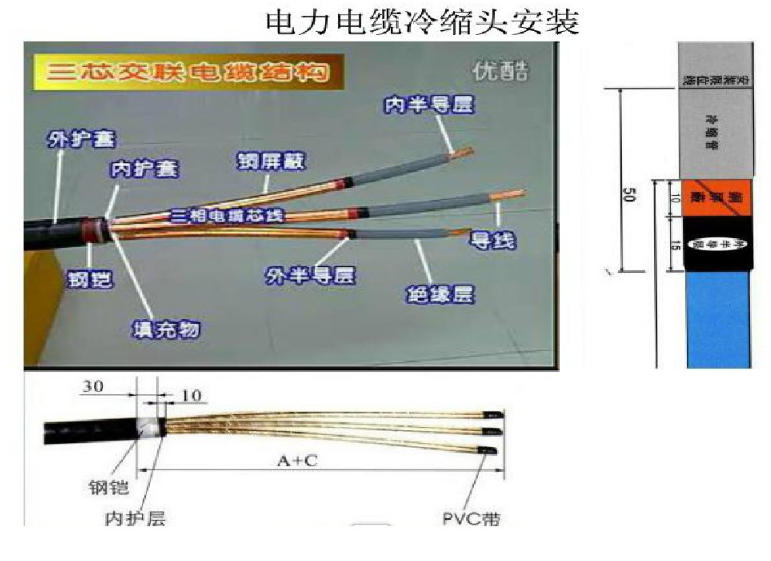 关键点:防止划伤铜屏蔽、留钢铠30mm、内护套10mm,并用扎丝或PVC带缠统钢铠以防松散。钢屏蔽端头用PVC带缠紧,以防松散和划伤冷缩管;